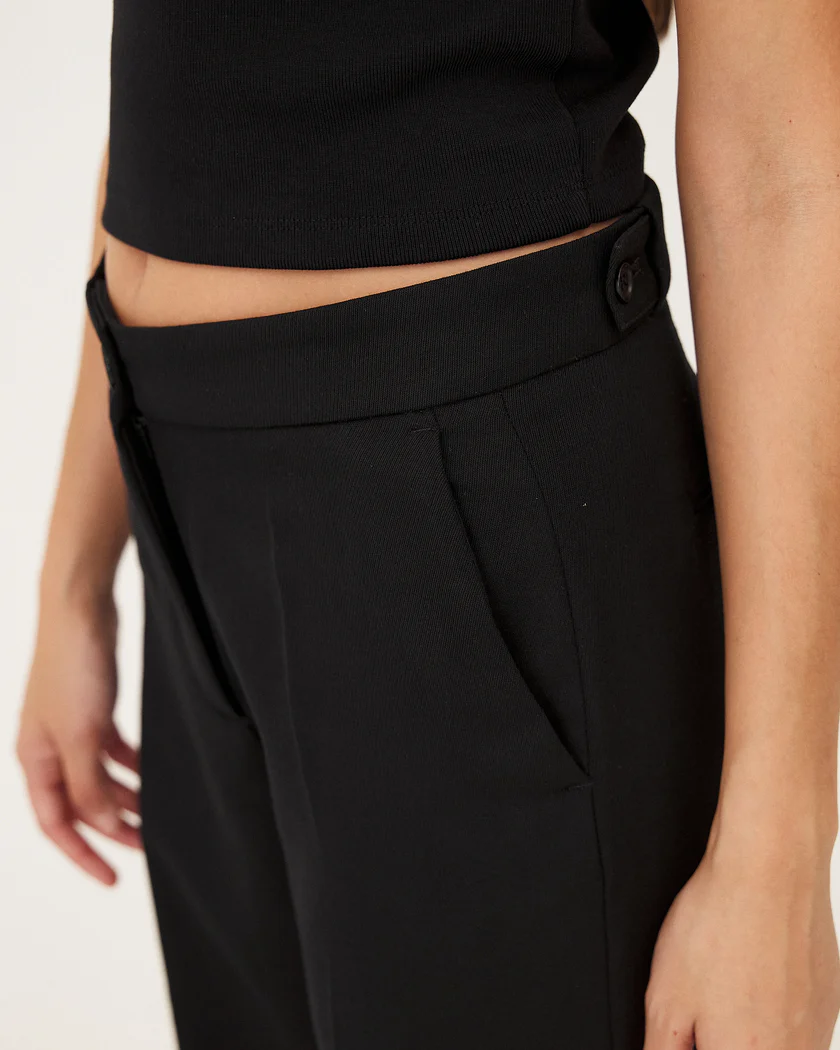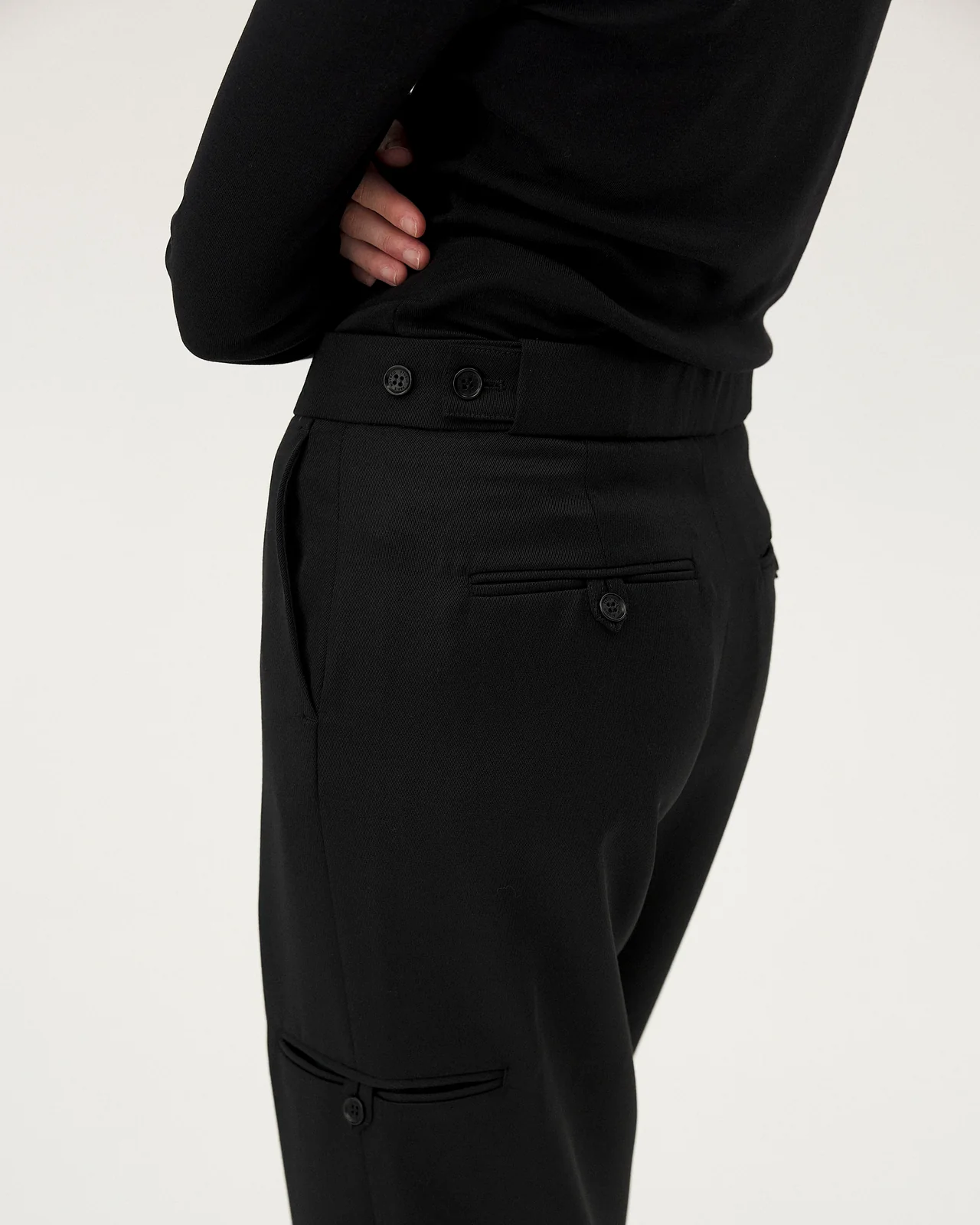 – Poches passepoilées fermable grâce à une fine languette sur le côté de la jambe et au dos