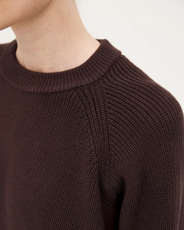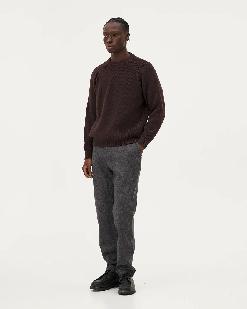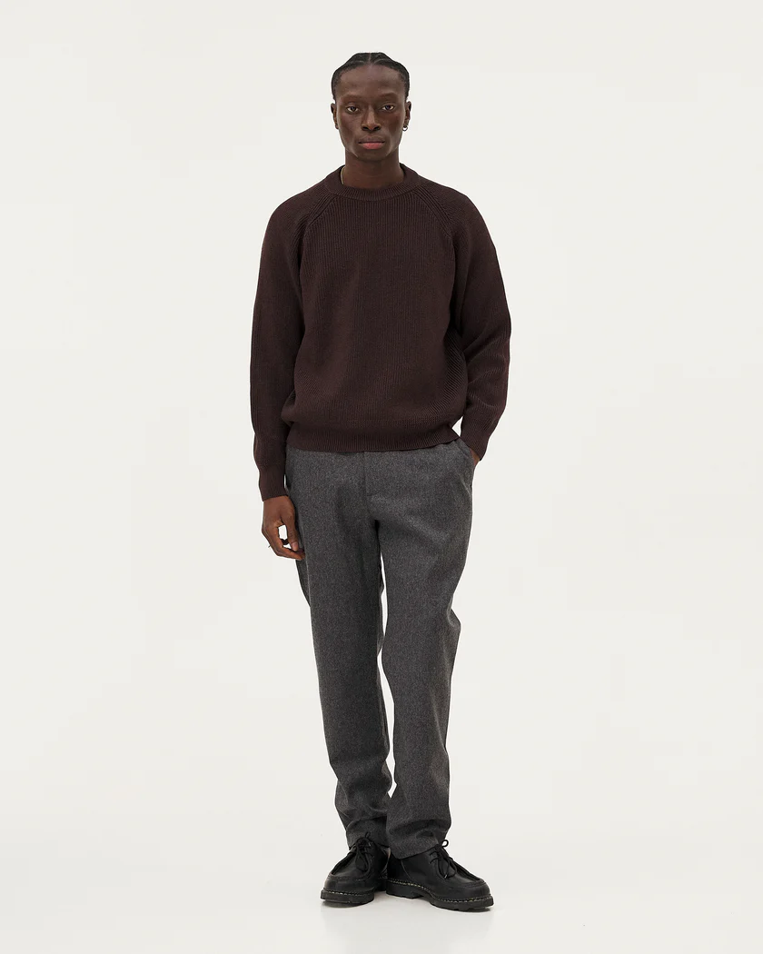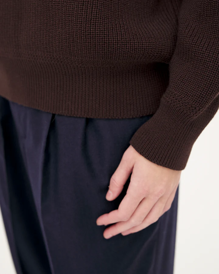 Le pull Oslo est tricotée dans une maille dense, lourde et texturée en côtes perlées en laine mérinos et coton biologique certifiée RWS du filateur Italien Tollegno.