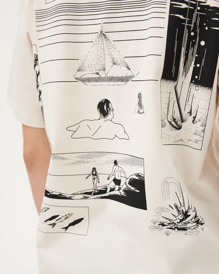La marque a travaillé sur le thème du mirage et du souvenir autour d’un imprimé narratif inspiré des bandes dessinés qu’il développe dans son travail personnel.