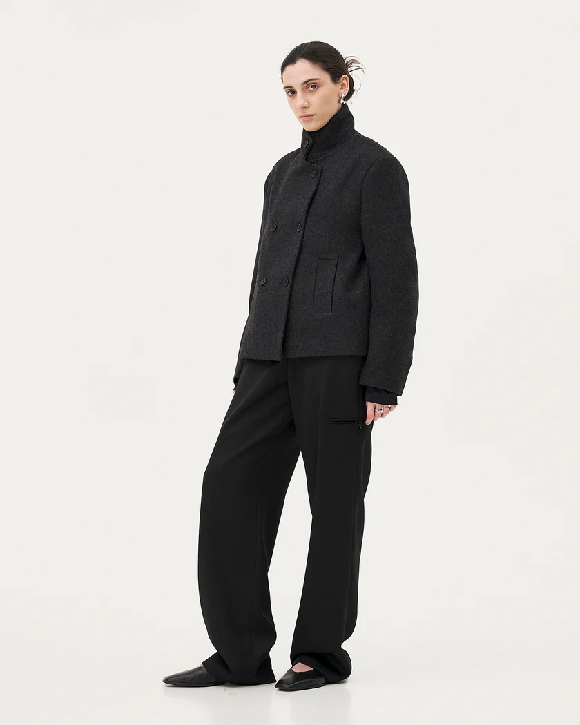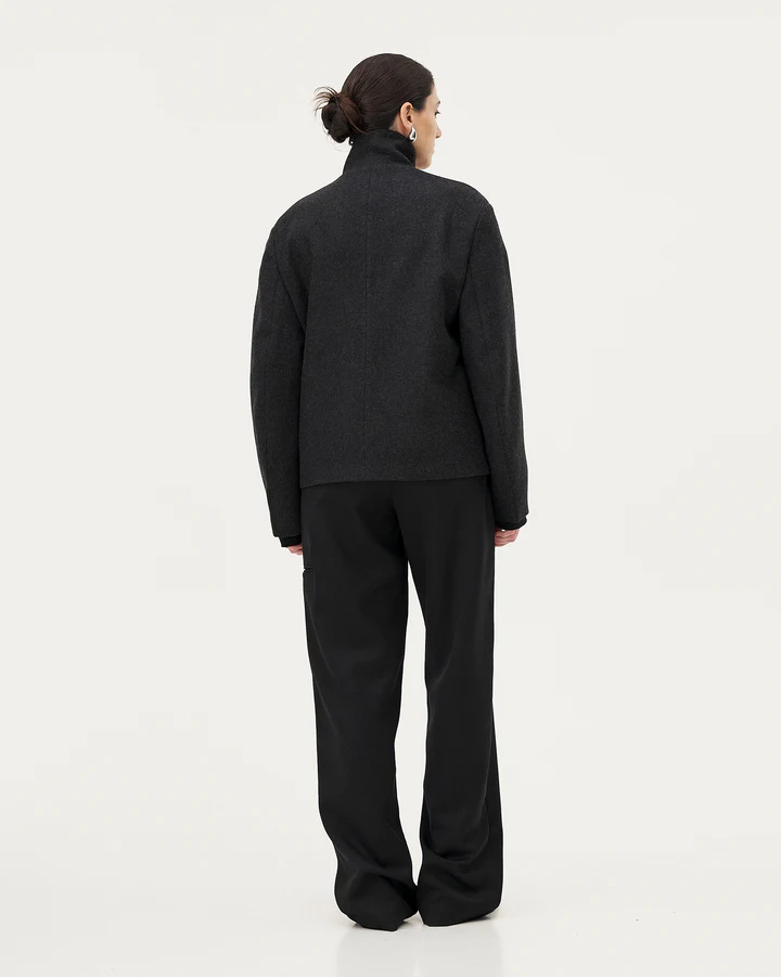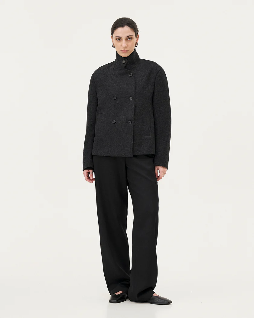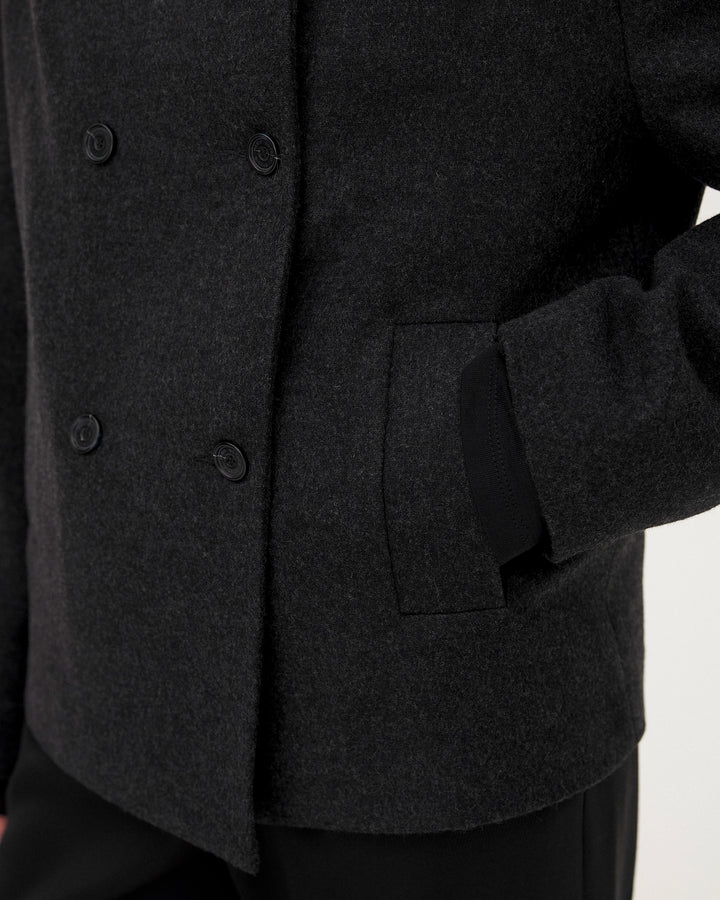 Le modèle Velia est une veste courte aux épaules à la fois structurées et arrondies, offrant une silhouette élégante.